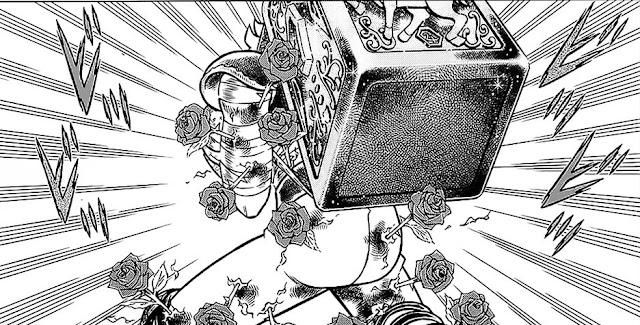 Por só ter 3 capítulos de 22 páginas, a série acaba ficando bem corrida (especialmente na primeira edição) e além da arte em si (afinal é o "Mestre"), a série também acaba apresentando alguns momentos constrangedores, como esse momento que o Aioros está quase saindo do Santuário quando é atingido por trás pelas Rosas Adagas do Afrodite, e bem... vejam vocês mesmos: